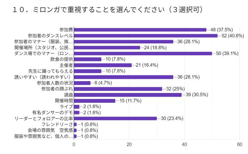 ミロンガについてのアンケートのお願い | この度、皆さんがどのようなミロンガを望まれ、どのような気持ちで主催、参加されていうかのアンケートを実施しています。 よりよいタンゴ場を作るために参考になればと思います。是非ご意見をお願いします 書いていただいた内容は開示しますので、普段 主催者、参加者等に言いたいことがあればぜひご意見ください 完全匿名で名前、メール、IDそのた一切私もわかりません。また、その他意見の欄に書かれた具体的なミロンガ名などの固有名詞については良い内容でも悪い内容でも開示しませんので思ったままをお書きください https://forms.gle/RFrpDtjnykhL7D816 ここまでのアンケートの途中経過の一部です。今後集計して公開します 意見例 |